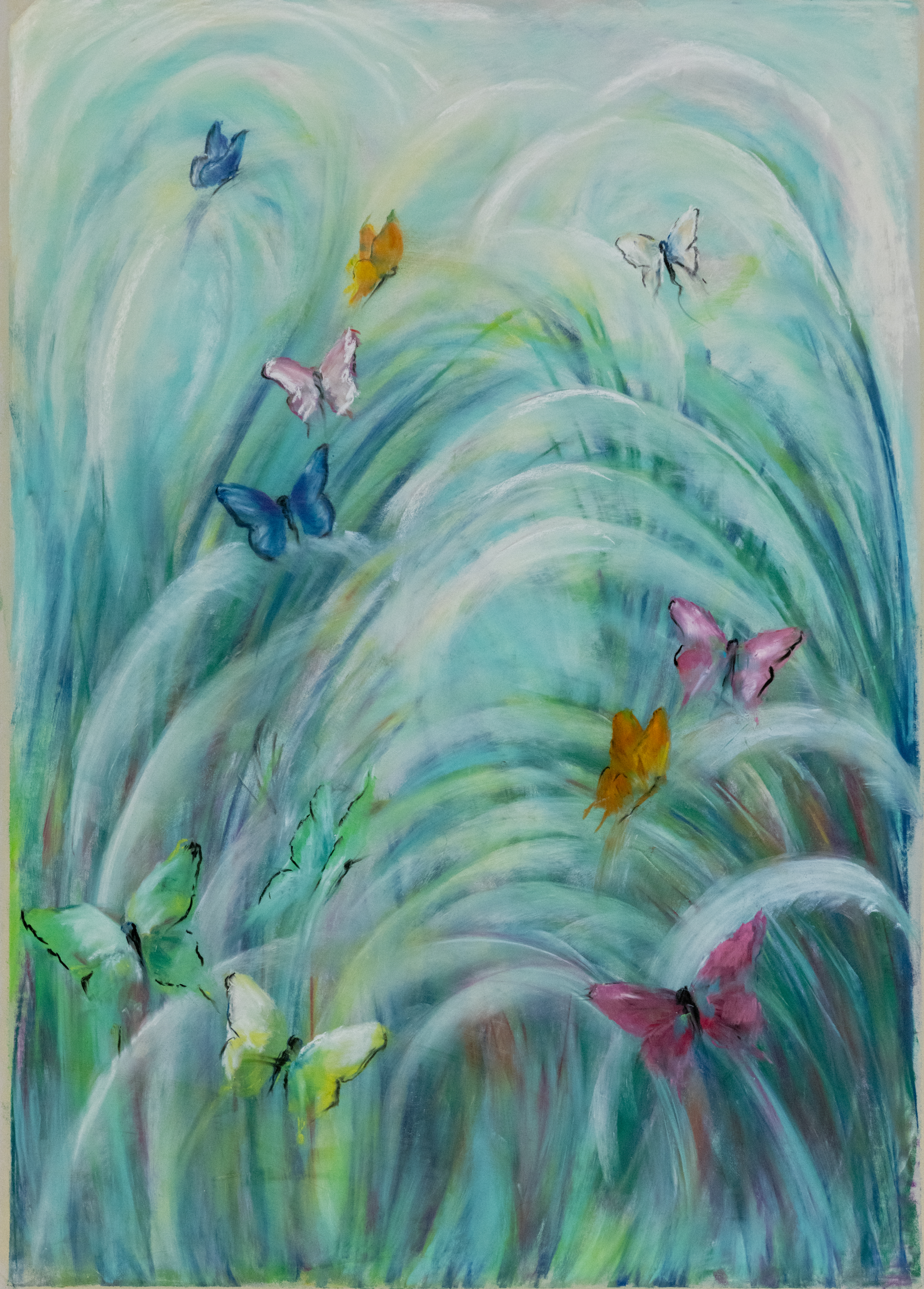 Subject Matter: The main subjects depicted are butterflies gracefully navigating through long, flowing green grass, symbolising freedom, transformation, and the acceptance of change.