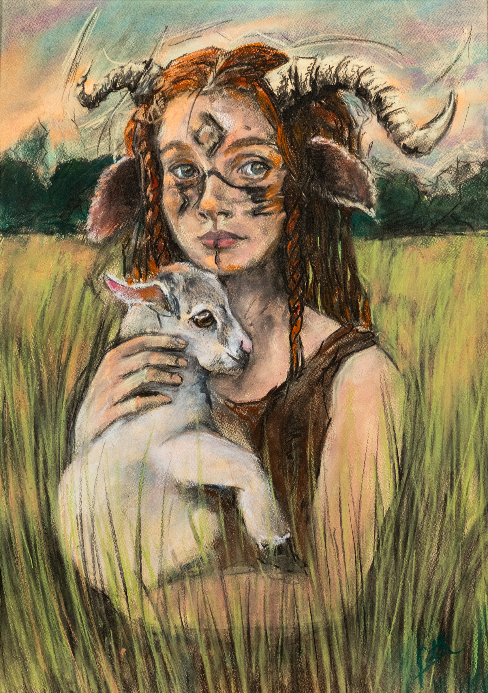 The image depicts a child dressed as a goat, complete with horns and ears, with face paint and unkempt hair. The child is in a field, cradling a baby goat in her arms. Despite the playful costume, there is a sense of melancholy in her eyes as she tenderly cuddles the goat close to her. The juxtaposition of the child's appearance and expression, along with the presence of the baby goat, evokes a poignant and emotional scene.