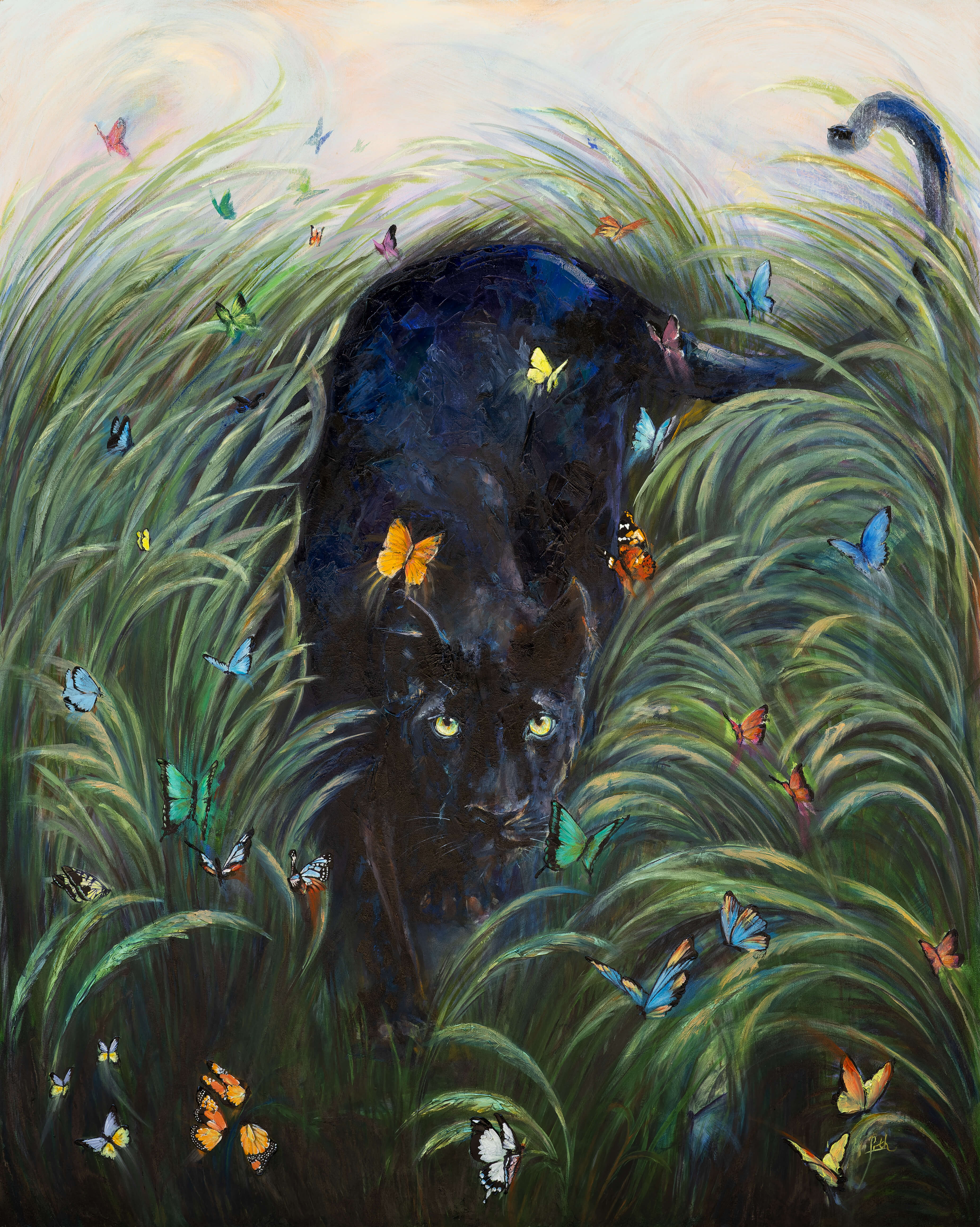 This painting has a feminine quality shown in the soft, pinks and the gentle, brushing of the grasses against the powerful body of the panther, which is painted in palette, knife to accentuate the power and courage of the big cat.