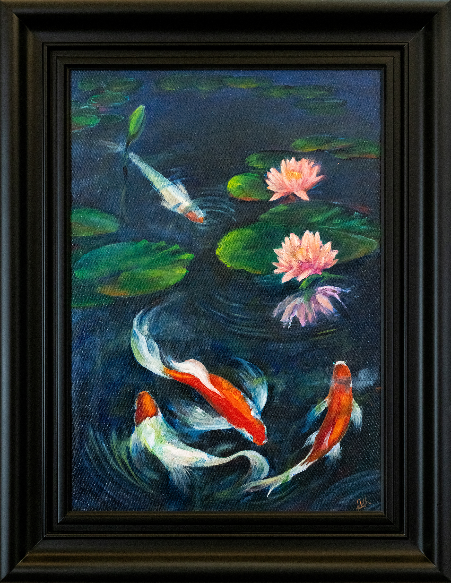 An oil painting framed in a thick black frame, showcasing koi fish in a serene pond. The piece features delicate water lilies and lily pads, with deep, rich colours in the water that beautifully contrast with the bright orange fish, enhancing the overall moody atmosphere of the artwork.