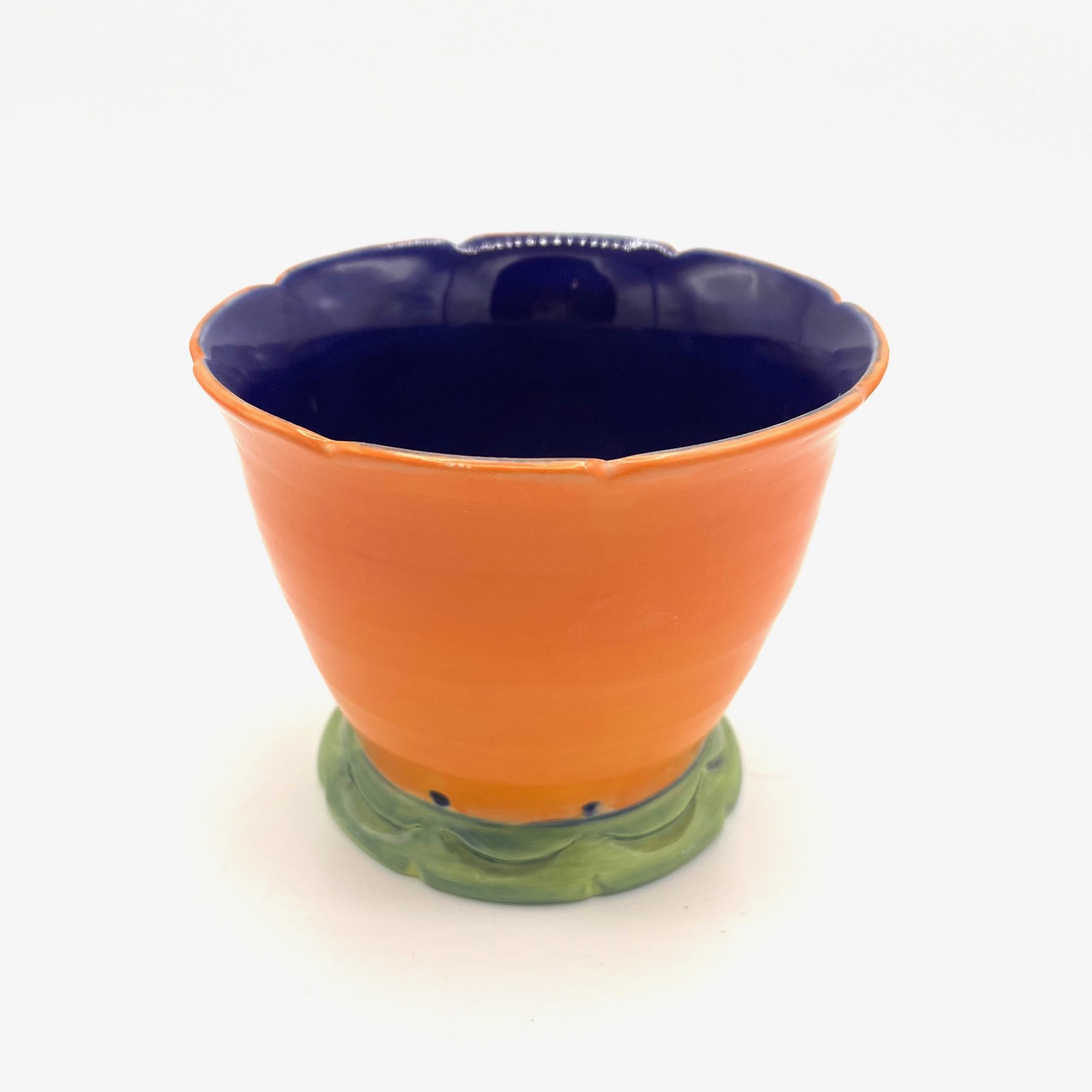 Introducing the Orange Bowl, a vibrant and beautifully crafted piece that brings a splash of color and artistry to any space. This bowl features a striking orange body, complemented by a green base that adds a fresh and lively contrast. The interior is a deep, dark blue, creating a rich and captivating visual experience that draws the eye.