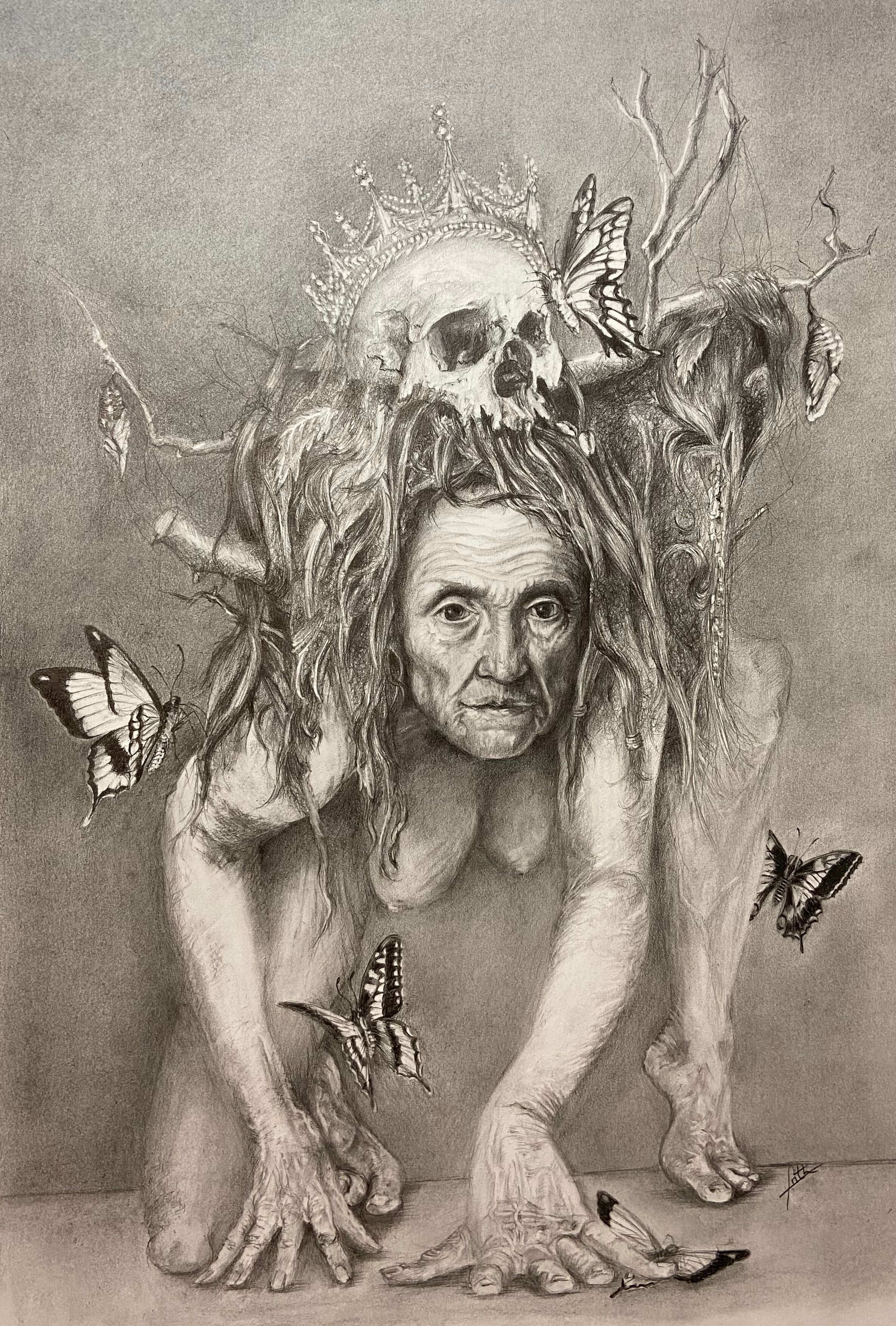 Yet, the piece transcends mere fear. It symbolises change, highlighted by the presence of butterflies. While the old woman crushes one butterfly, others are emerging in her hair, signifying that she cannot escape the inevitability of transformation. The skull intertwined in her hair represents the death of societal ideals surrounding fertility and beauty. This moment of acceptance allows women to embrace their true selves, free from preconditioned concepts.