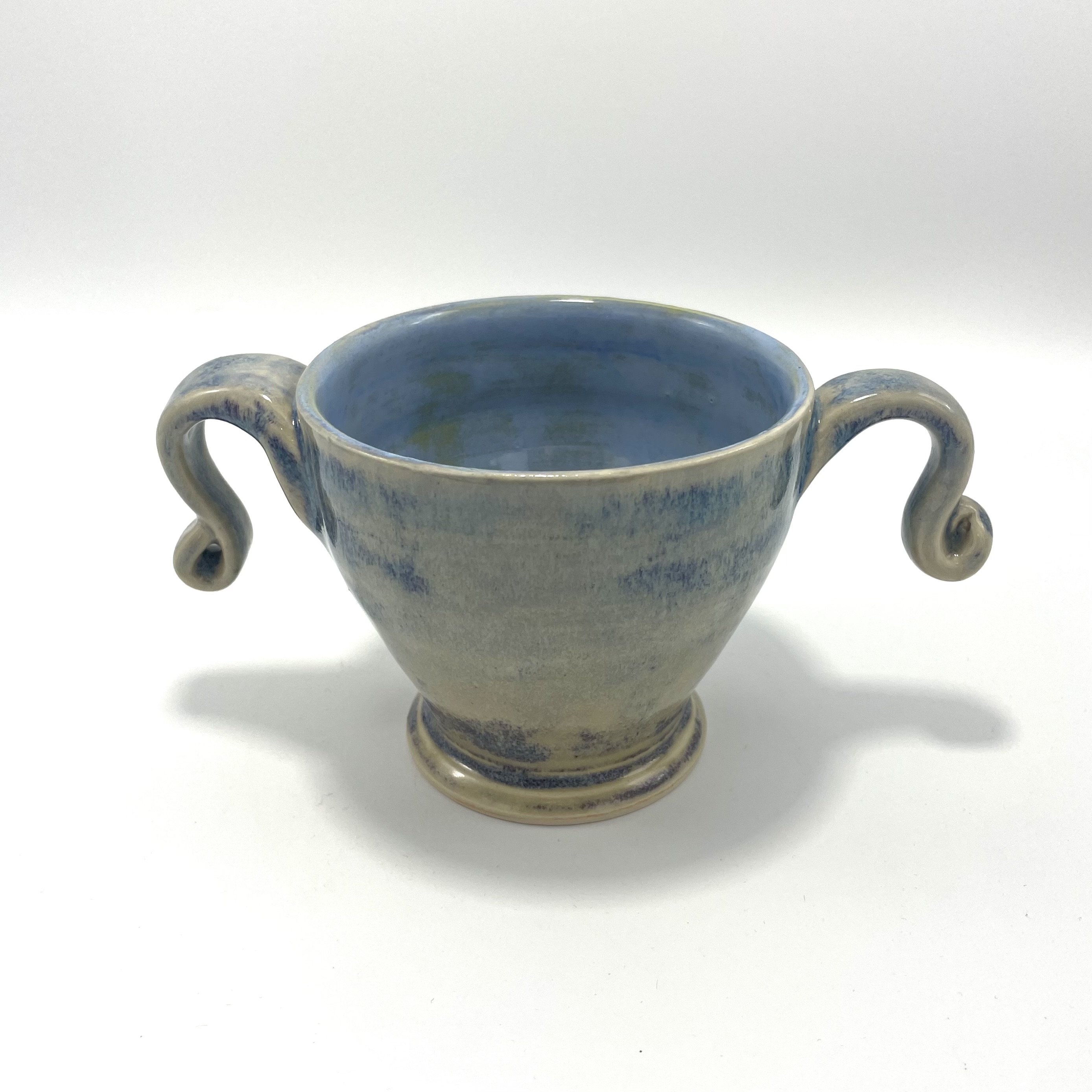 Introducing the Twin Tales cup, an artful creation that combines beauty and functionality. This piece is adorned with a glossy finish both inside and out, enhancing its visual appeal. The exterior features a charming, irregular pattern in soft blue tones, offering a calming, artistic flair. The inside is a lighter shade, creating a pleasing contrast.